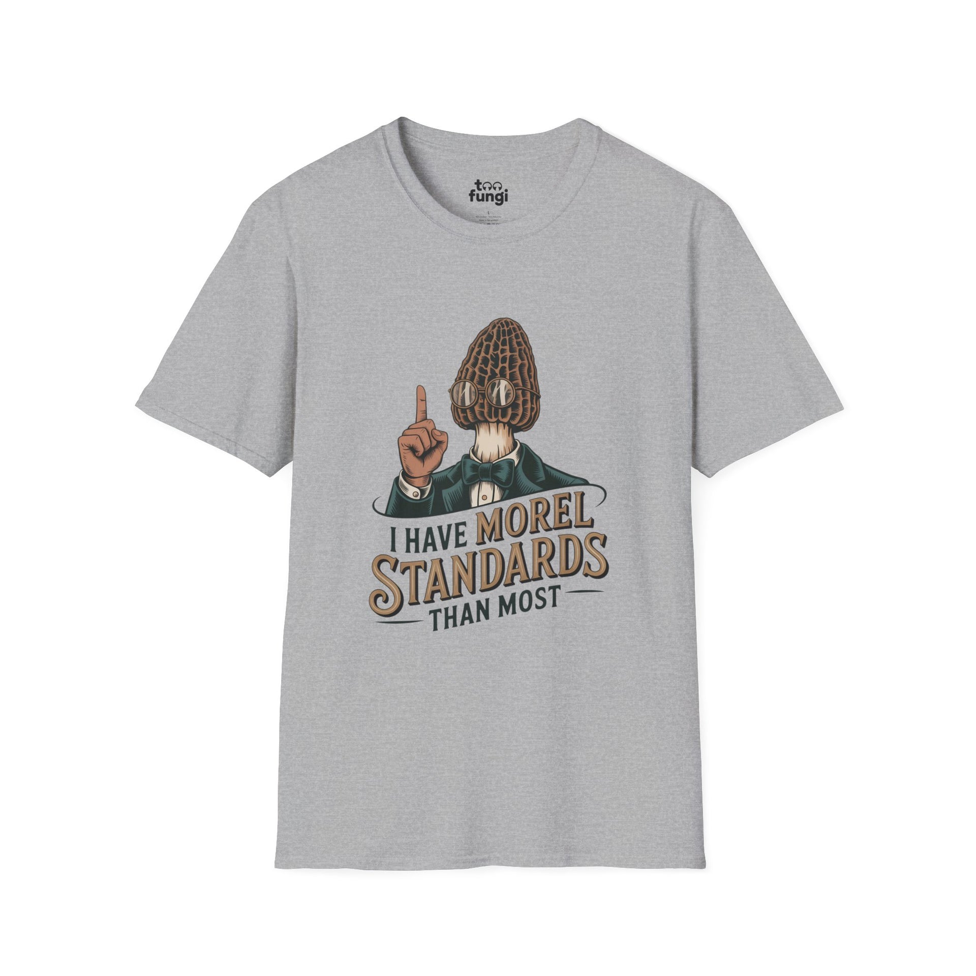 Make a statement with this witty "I Have Morel Standards Than Most" t-shirt! Featuring a distinguished morel mushroom character dressed in a dapper green suit, bow tie, and round glasses, this clever design combines mycology...